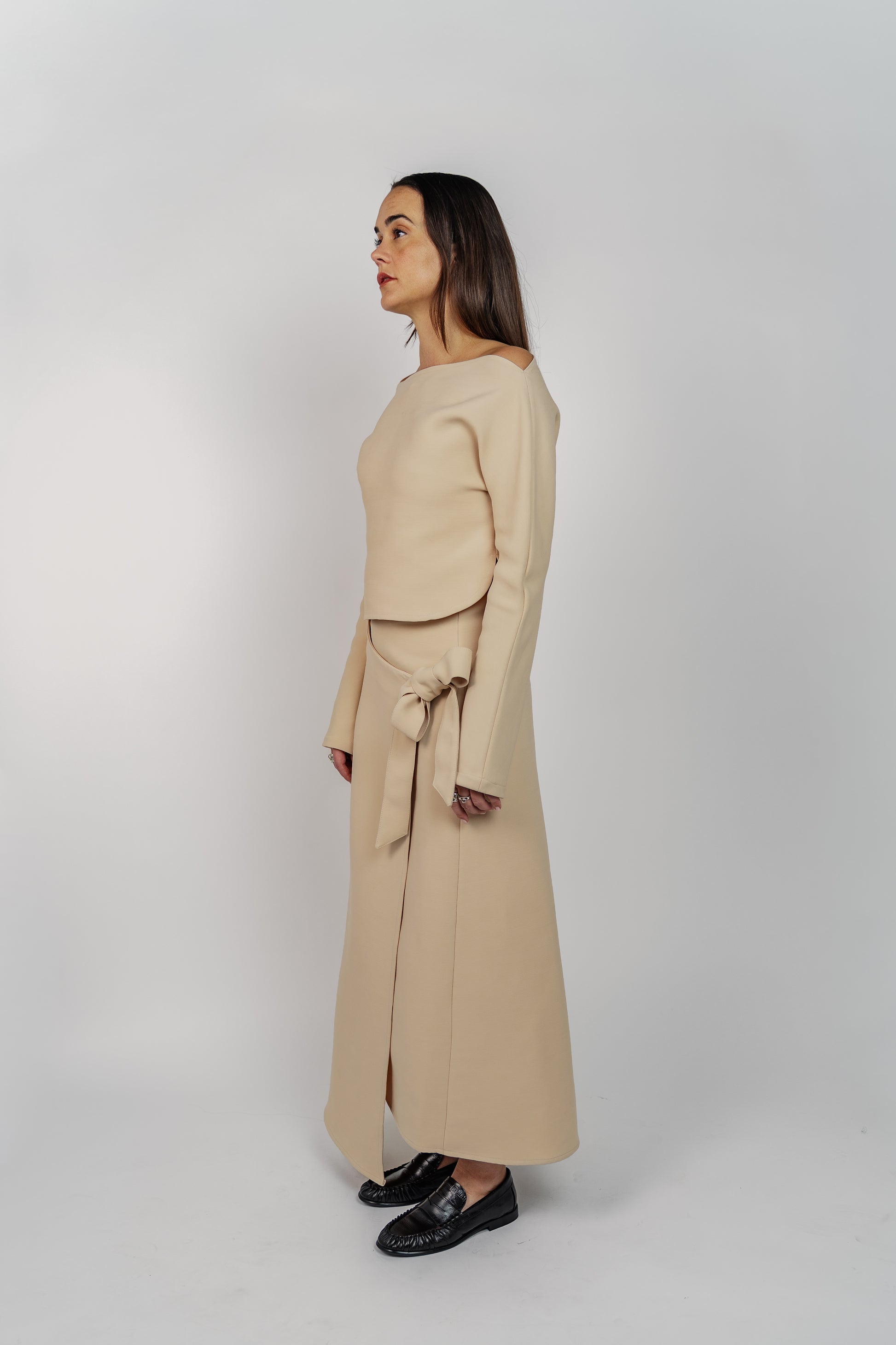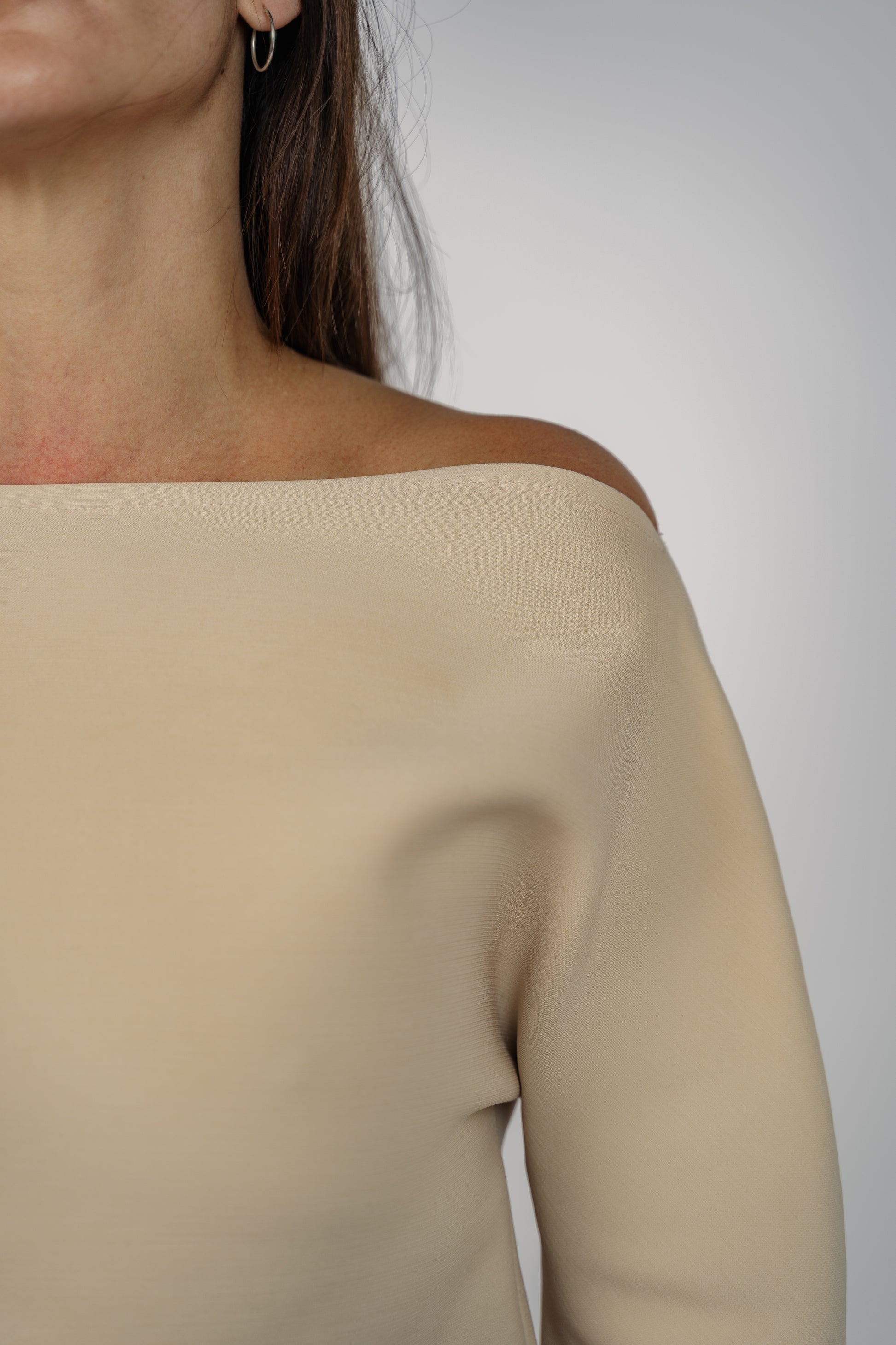 Ce top à manches longues avec col bateau allie une matière très structurée à une coupe parfaitement ajustée. Son col bateau met en valeur les épaules avec délicatesse. La couleur ici est Ivory cream.